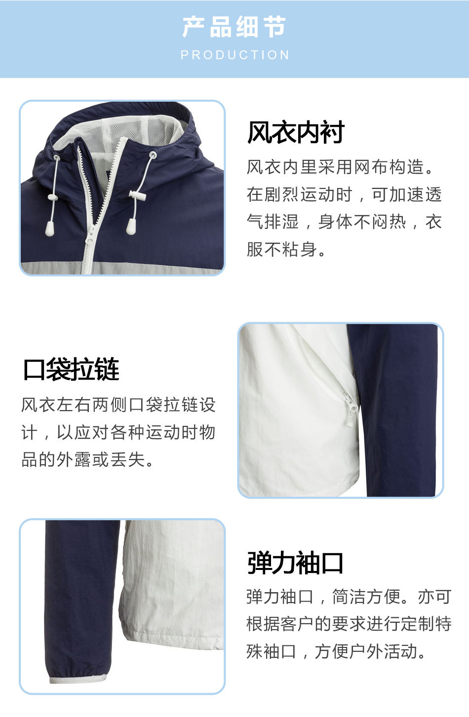 風衣內襯:風衣內里采用網(wǎng)布構造。在劇烈運動時,可加速透氣排濕,身體不悶熱,衣服不粘身,專業(yè)團體風衣定制。