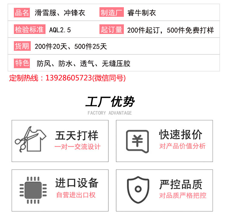 骨位壓膠:壓膠滑雪服生產(chǎn)的每個(gè)車縫骨位均壓膠處理,有效防止雨水浸入。